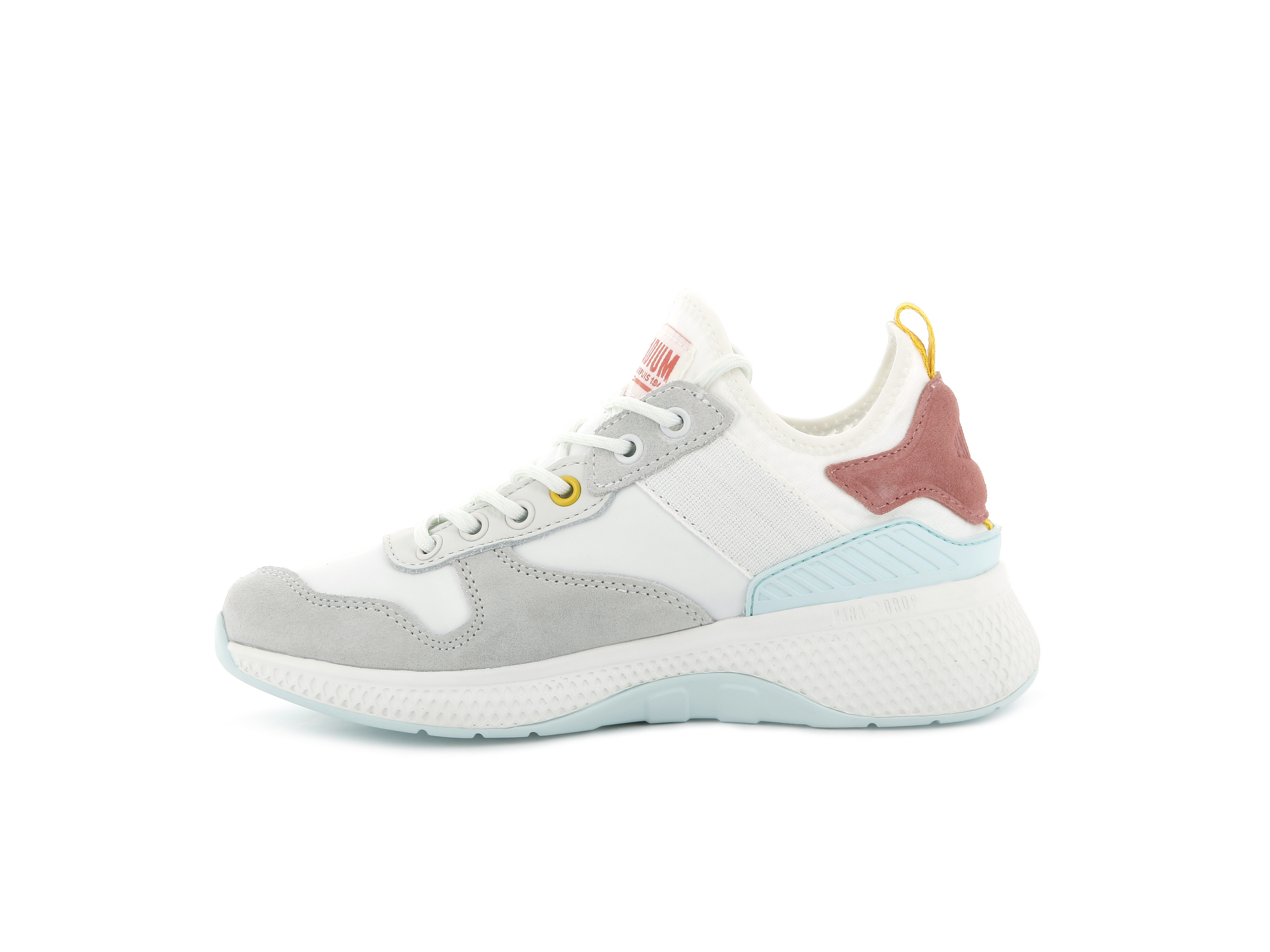 • MARQUAGE : étiquette tissée sur la languette / étiquette tissée sur le quartier externe / écusson Palladium sur le contrefort / imprimé GPS sur la doublure de la languette