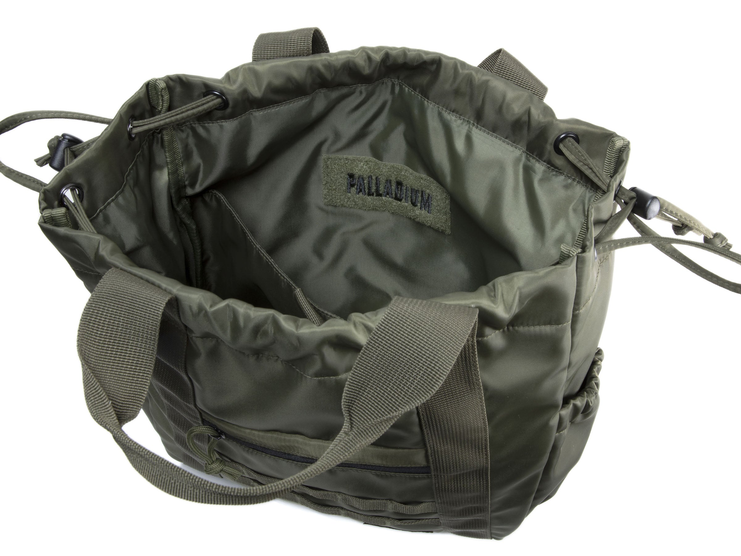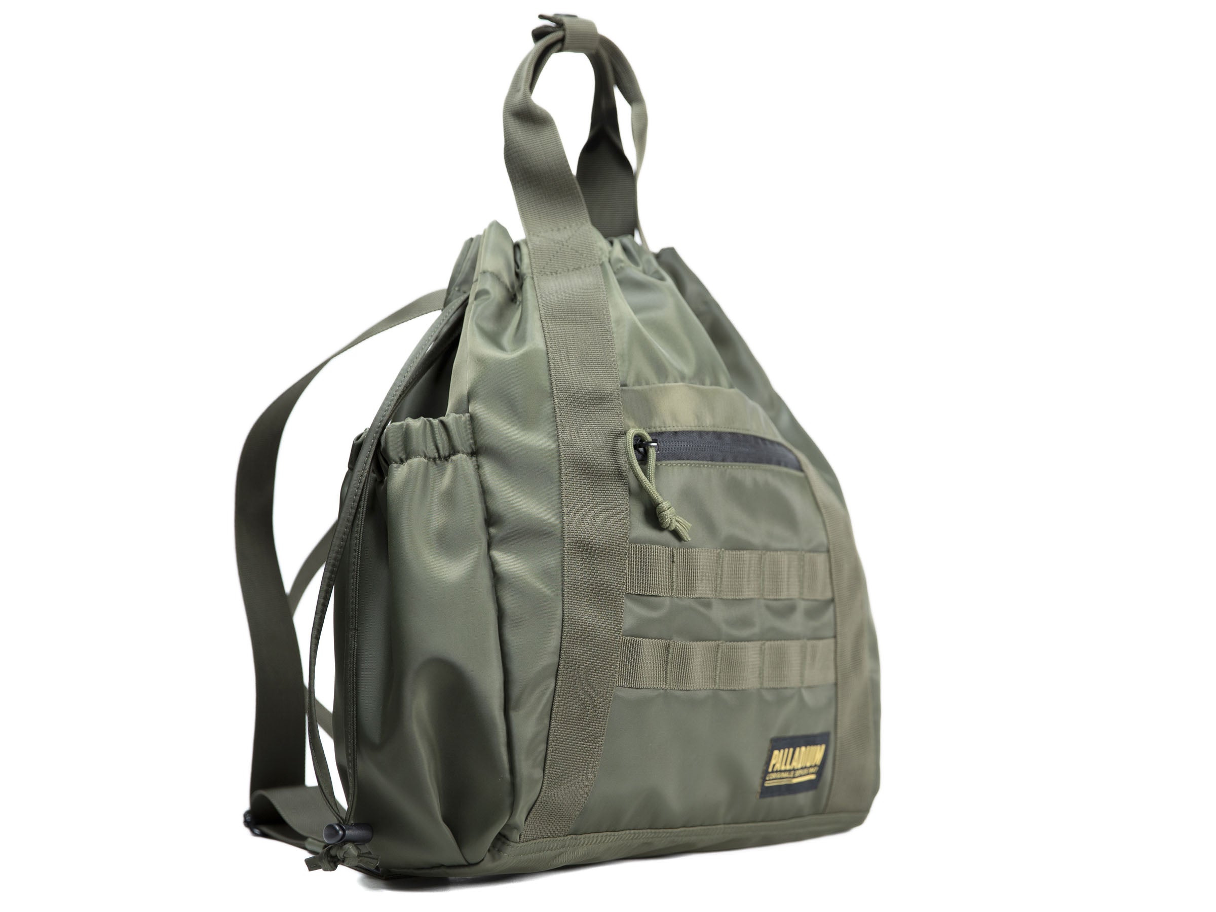 The Totebag is the hybrid mix of a backpack and a totebag, on one single easy-to-wear bag. The handles allow you to carry it by hand while you can also chose to put it on your back with the 2 shoulderstraps. The duffel bag closure secures the interior of the bag. In terms of functionality, the main compartment is complemented by 2 side pockets and a zippered front pocket. In soft nylon, the Totebag is a lifestyle variation of the army wardrobe, Palladium signature since 1947.